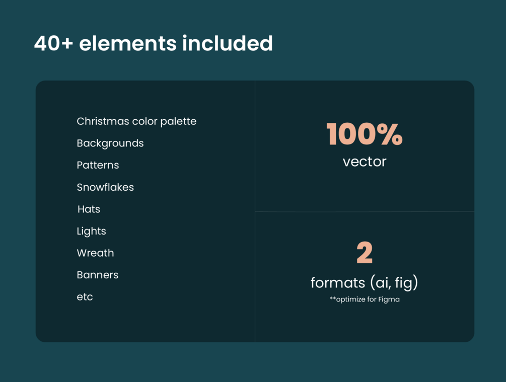 - 40+ elements + 3 styles (snow patterns, hats, lights, wreath, miscellaneous and banners)